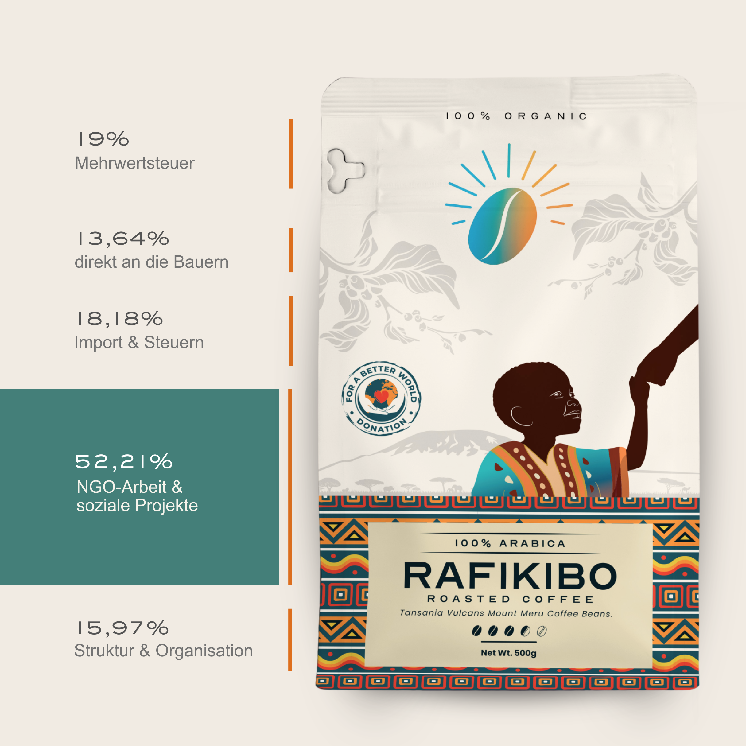 Ein Anteil von 13,64 % geht direkt an die Bauern,18,18 % decken Importkosten und Steuern, weitere 18,18 % fließen in die Arbeit unserer NGO. Den größten Teil, 34,03 %, investieren wir in soziale Projekte wie Bildung, Ernährung und Wasserzugang. Die restlichen 15,97 % sichern Struktur, Organisation und den langfristigen Aufbau nachhaltiger Initiativen.
